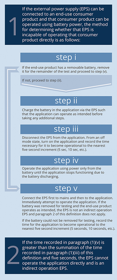 The new standard also defines power supplies asdirect operationandindirect operationproducts. Adirect operationproduct is an EPS that functions in its end product without the assistance of a battery. Anindirect operationEPS is not a battery charger but cannot operate the end product without the assistance of a battery. The new standard only applies todirect operationexternal power supplies.Indirect operationmodels will still be governed by the limits as defined by EISA2007. The DOE has provided the following instructions (Figure 3) to help distinguish between direct and indirect operation power supplies: